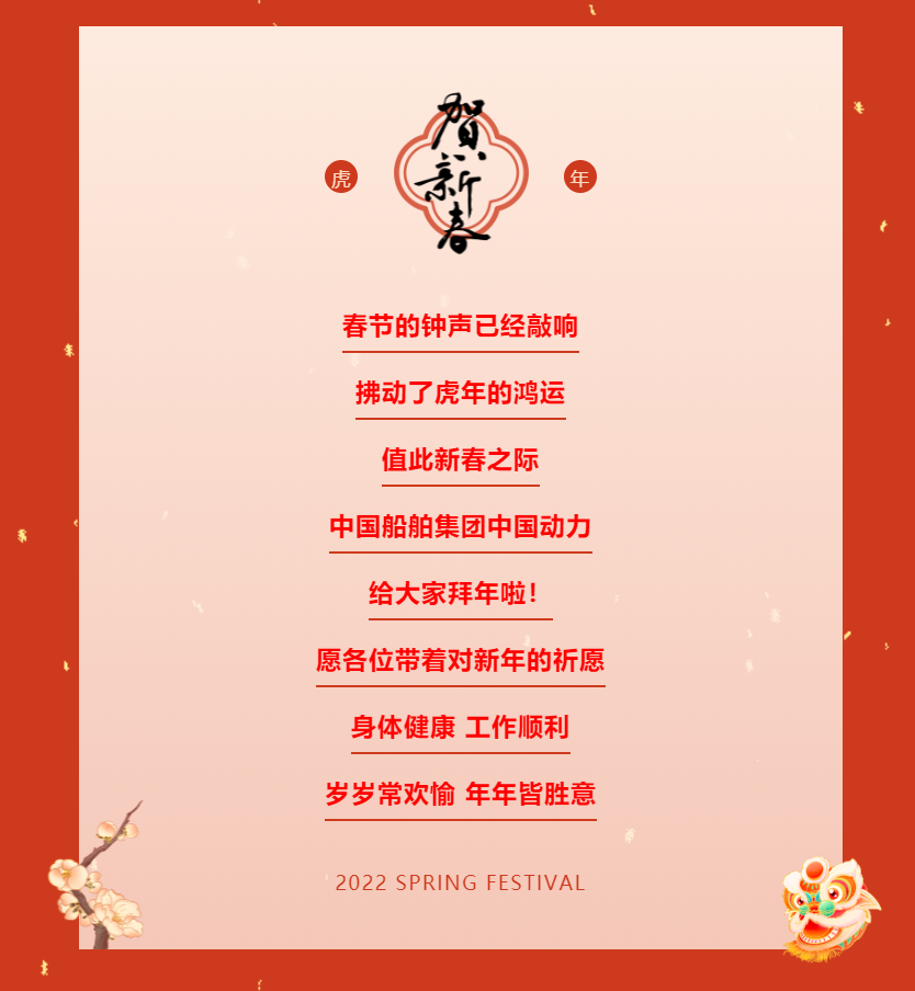 中國(guó)船舶集團(tuán)旗下中國(guó)動(dòng)力恭祝大家新春快樂!——?dú)q歲常歡愉,年年皆勝意。