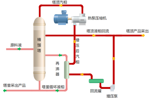 該項(xiàng)目使用熱泵壓縮機(jī)對(duì)精餾塔頂氣進(jìn)行增壓,以提高其溫度品位,再將其送往塔釜再沸器作為熱源使用,替代原本蒸汽熱源,從而大幅減少一次蒸汽以及塔頂冷卻水耗量,從工藝上實(shí)現(xiàn)精餾過程的節(jié)能減碳。