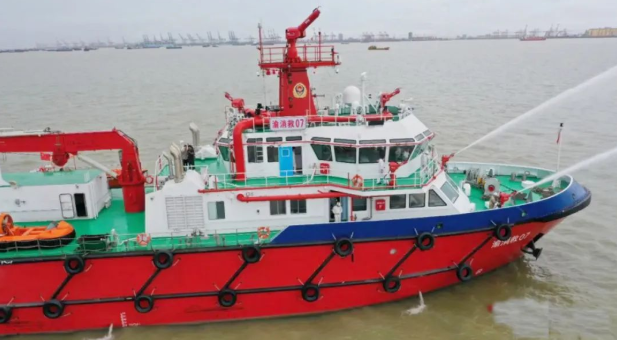 60米綜合救援船型寬13米,型深4.5米,總噸位1340噸,最大航速28km/h,入級CCS第三類消防船,命名為“渝消救07”,為重慶市消防救援總隊(duì)綜合應(yīng)急救援專用消防船。