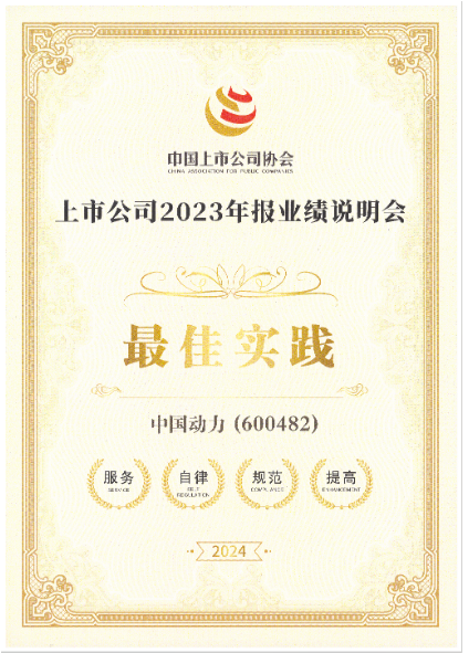 近日,中國上市公司協(xié)會頒布上市公司 2023 年報業(yè)績說明會的獲獎情況,中國動力榮獲最佳實踐獎!