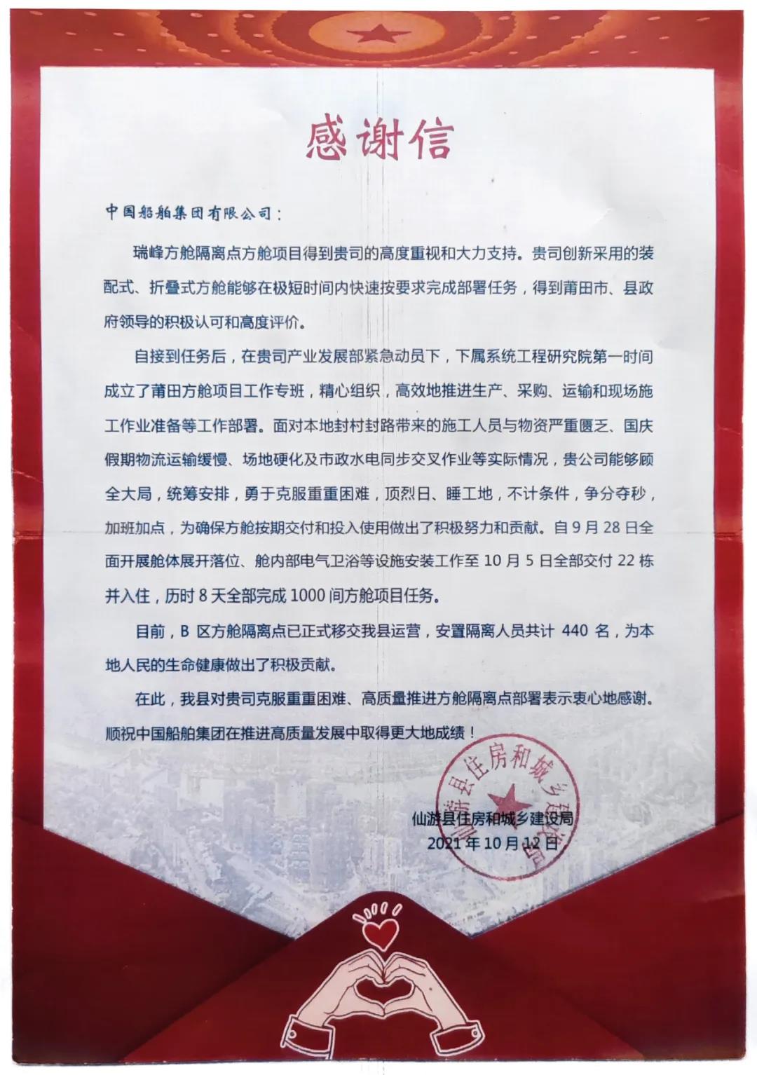 近日,中國(guó)船舶集團(tuán)收到了福建省莆田市仙游縣住房和城鄉(xiāng)建設(shè)局發(fā)來(lái)的一封感謝信。
