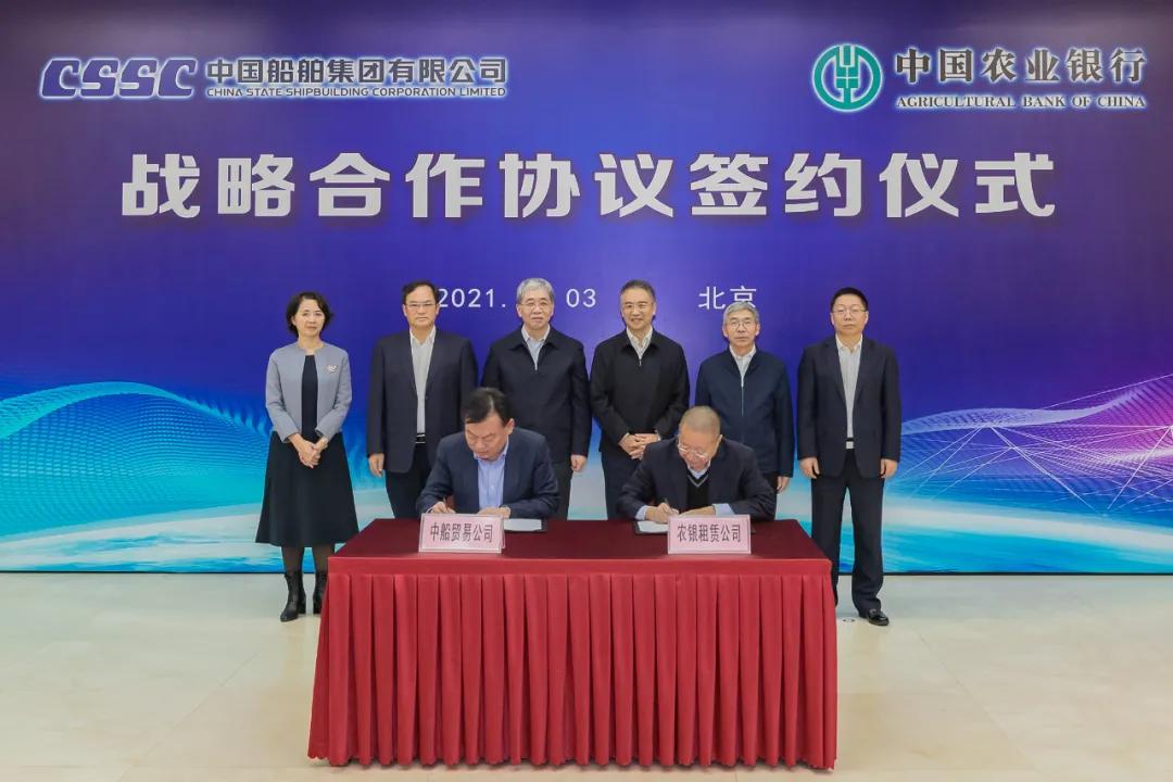 會上,在雙方領導的共同見證下,中國船舶集團旗下中船貿(mào)易與農(nóng)業(yè)銀行農(nóng)銀租賃簽署相關合作協(xié)議。