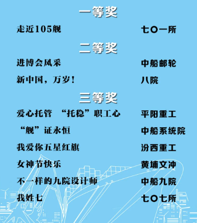 由中國船舶集團(tuán)黨群工作部指導(dǎo),中國船舶集團(tuán)新聞宣傳中心/中國船舶報(bào)社承辦的中國船舶集團(tuán)第二屆短視頻大賽圓滿落幕。經(jīng)過前期篩選,網(wǎng)絡(luò)投票,并特邀國務(wù)院國資委新聞中心、國防科工局新聞宣傳中心、中央電視臺、微博政務(wù)、中國船舶集團(tuán)黨群工作部專家評審,大賽最終評出一等獎(jiǎng)5部,二等獎(jiǎng)10部,三等獎(jiǎng)23部,同時(shí)評出優(yōu)秀組織獎(jiǎng)單位6家。名單如下,快來圍觀!