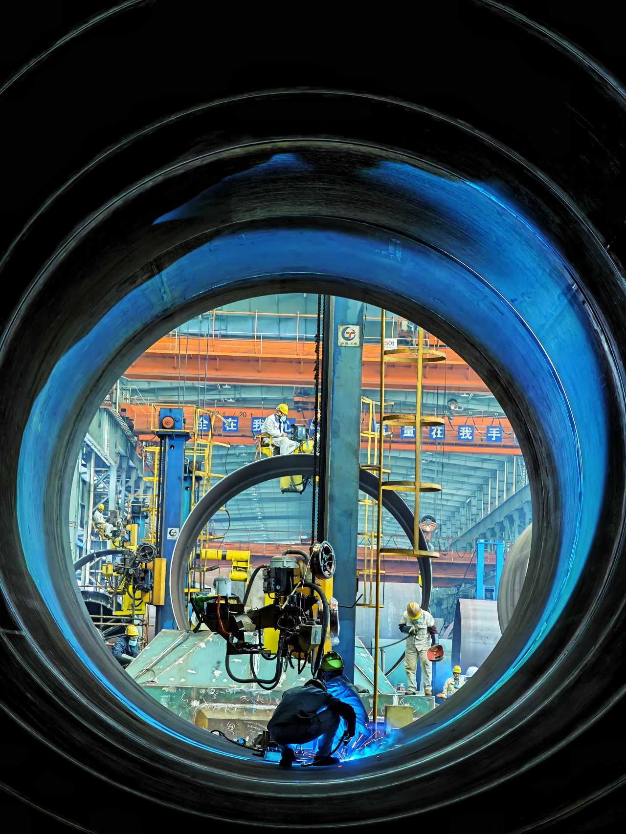 一位“全副武裝”正在進行焊接作業(yè)的焊工,焊花飛舞在狹小的工間里,折射出如彩云般的景象,猶如巨人正在“補天”。