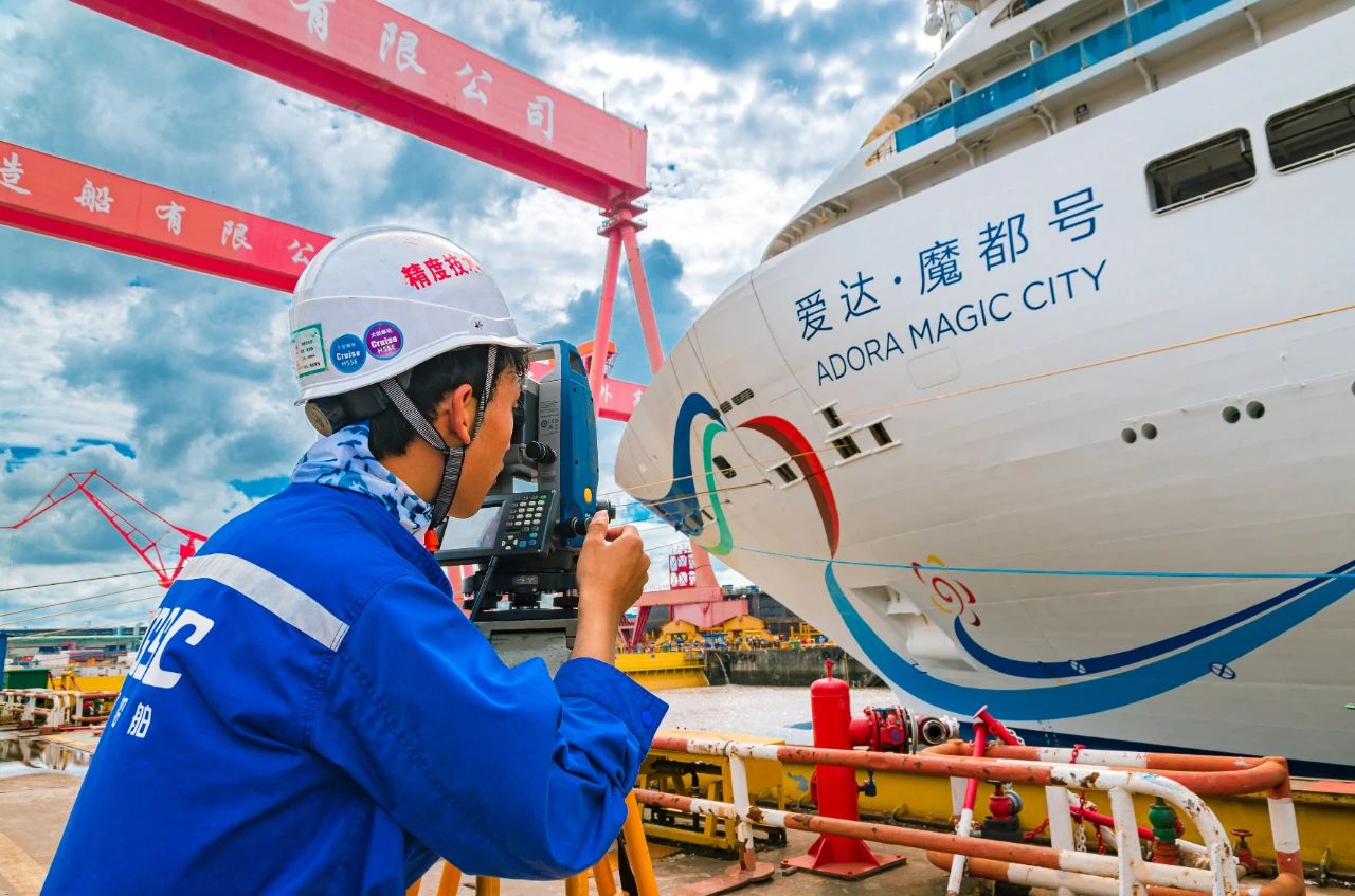 精度技術(shù)部的員工正在監(jiān)測國產(chǎn)首艘大型郵輪試航歸來時的精準坐墩數(shù)據(jù)。