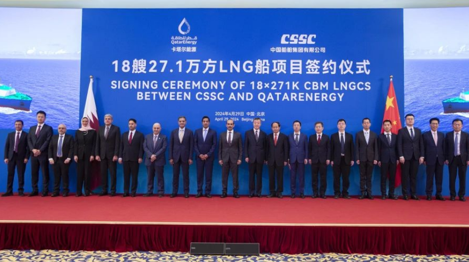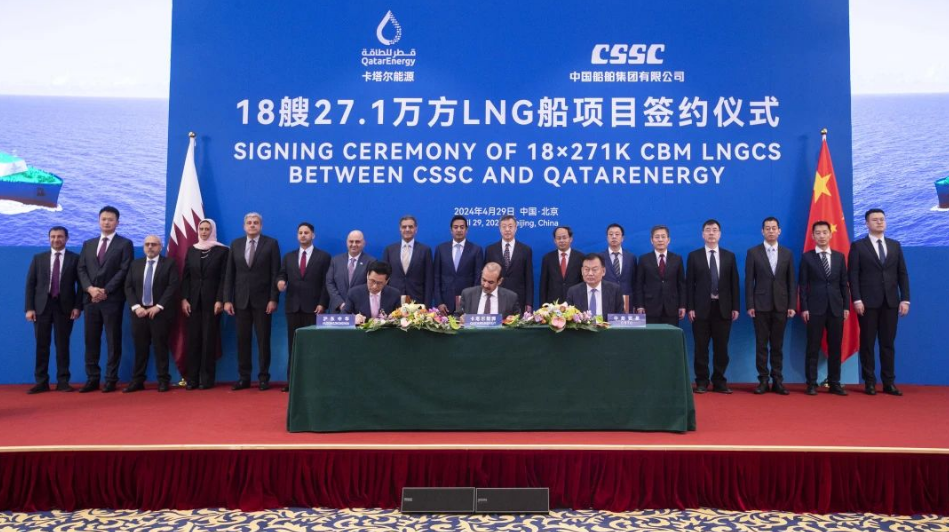 4月29日,中國船舶集團有限公司與卡塔爾能源在京舉行18艘全球最大27.1萬立方米超大型液化天然氣(LNG)運輸船項目簽約儀式。工業(yè)和信息化部副部長單忠德,外交部西亞北非司大使呂健,中國船舶集團董事長溫剛、副總經(jīng)理盛紀綱,卡塔爾能源事務(wù)國務(wù)大臣、卡塔爾能源總裁兼首席執(zhí)行官薩阿德·謝里達·阿爾卡比,卡塔爾能源天然氣首席執(zhí)行官卡利德·阿爾-塞尼,卡塔爾能源商務(wù)和業(yè)務(wù)發(fā)展執(zhí)行副總裁賈西姆·阿爾馬拉祖齊等領(lǐng)導和嘉賓出席簽約儀式。