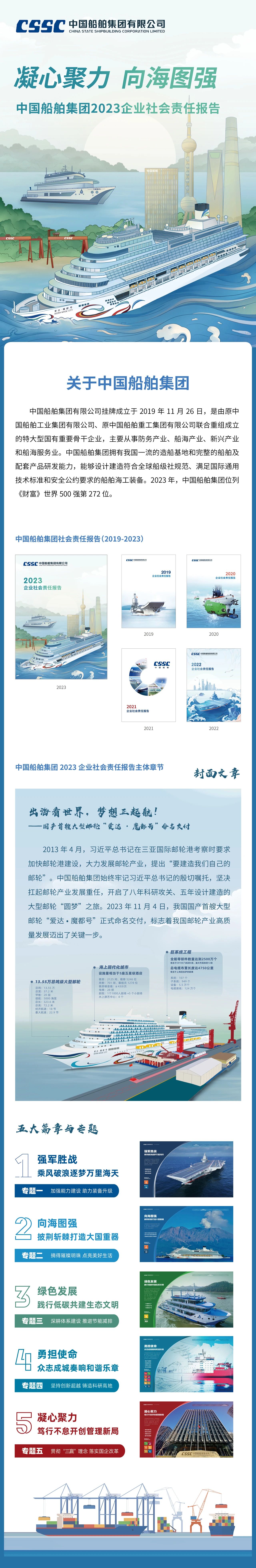 近日,中國船舶集團有限公司發(fā)布了《2023企業(yè)社會責任報告》(以下簡稱《報告》)。本報告是中國船舶集團正式發(fā)布的第五份企業(yè)社會責任報告。