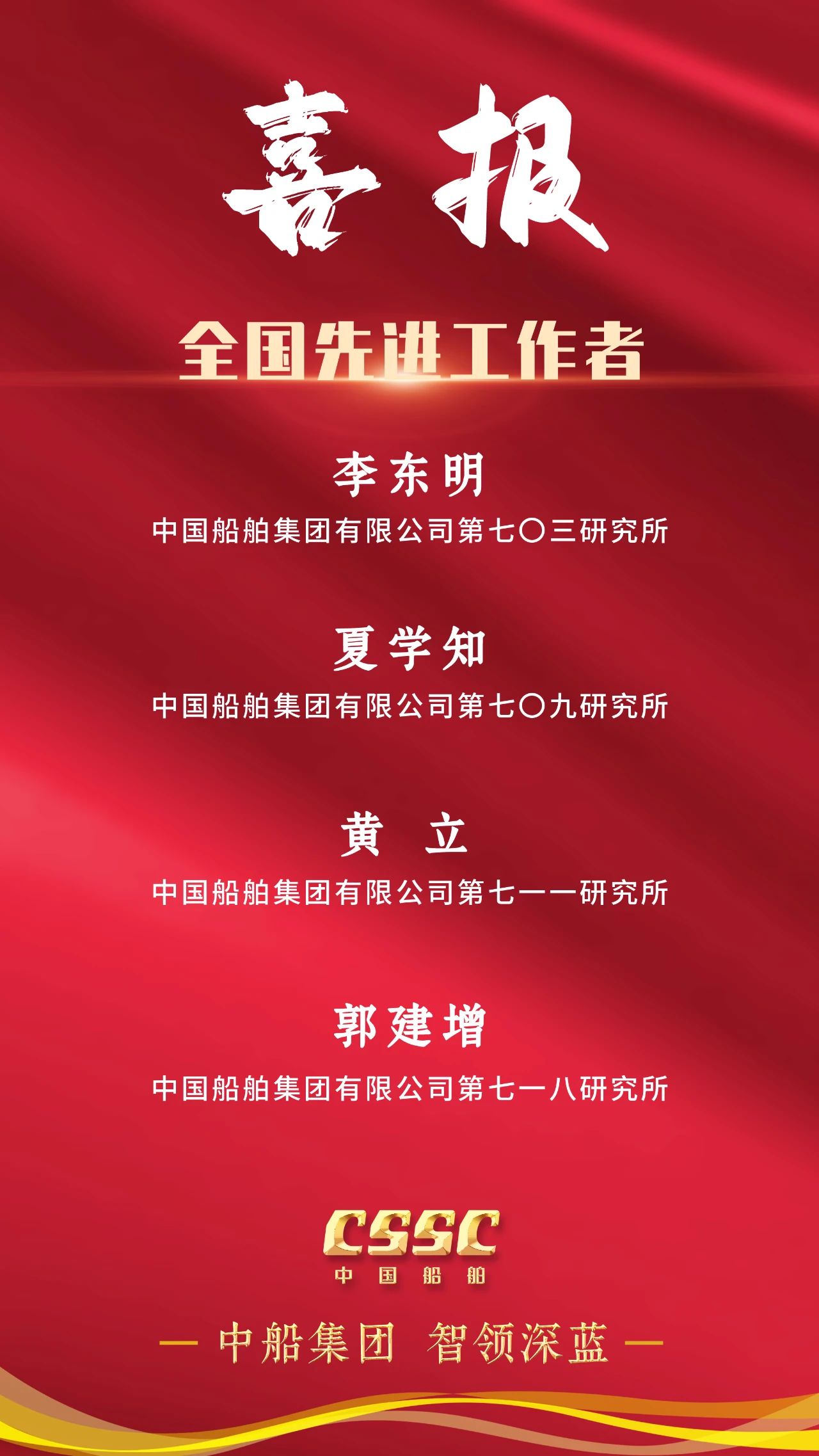4月28日上午,慶祝中華全國總工會(huì)成立100周年暨全國勞動(dòng)模范和先進(jìn)工作者表彰大會(huì)在人民大會(huì)堂隆重舉行。大會(huì)宣讀了《中共中央、國務(wù)院關(guān)于表彰全國勞動(dòng)模范和先進(jìn)工作者的決定》。中船集團(tuán)5人被授予全國勞動(dòng)模范稱號,4人被授予全國先進(jìn)工作者稱號。